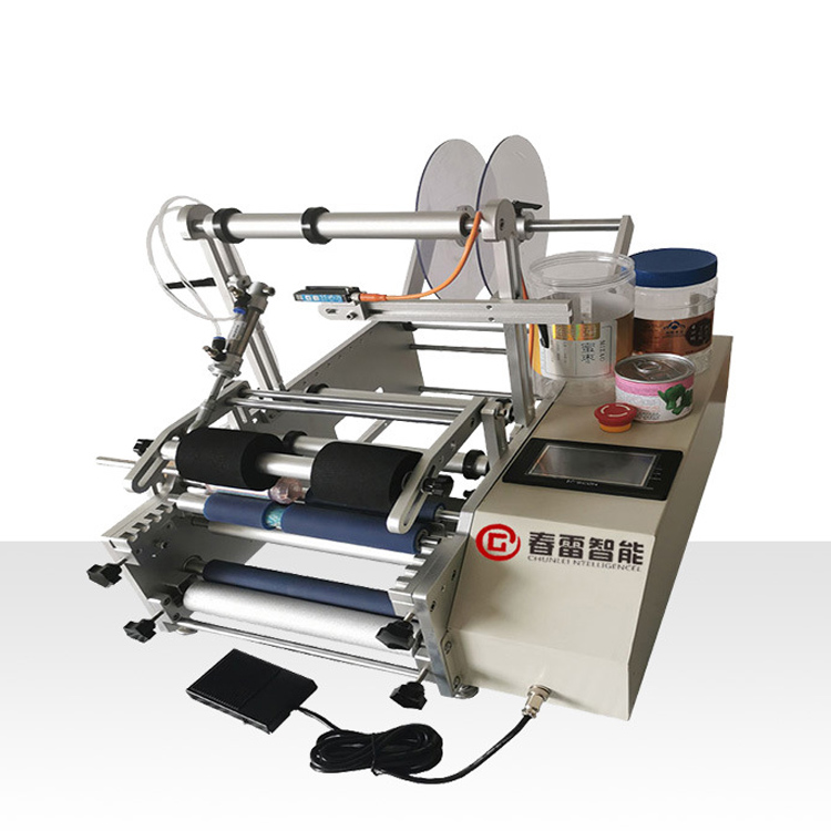 Полуавтоматска машина за етикетирање на тркалезни шишиња (вклучувајќи екран на екранот) е полуавтоматска машина за етикетирање, погодна за етикетирање на различни спецификации на цилиндрични предмети, етикетирање со мали конусни тркалезни шишиња, како што се ксилитол, козметички тркалезни шишиња, шишиња за вино итн. Изборна лента печатач и инк-џет печатач, етикетирање и печатење на бројот на производната серија и други информации во исто време, ги намалуваат процедурите за пакување и ја подобруваат ефикасноста на производството.